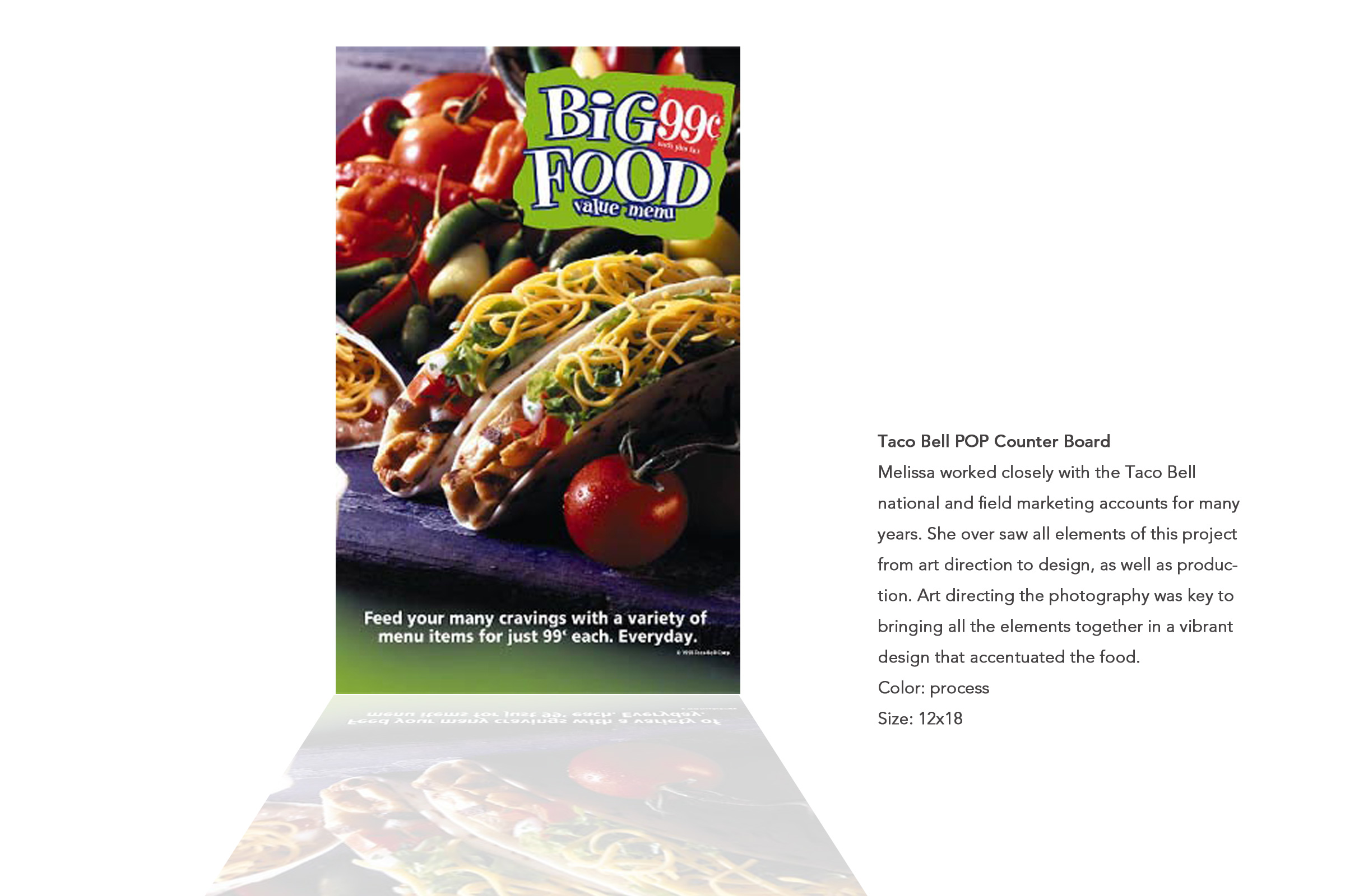 Santa Ana, CaliforniaRESPONSIBILITIES: Art Direct print ads, print collateral, photo shoots, and POP for Taco Bell National Field Markets. Developed concepts and designs for National Overlay Sales Promotion Kits and collateral. Managed file and data archive system for department. Ensured trouble free Mac systems, administration and technical support for associates.